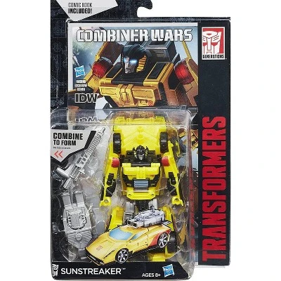 Transformers Generations Combiner Wars Deluxe Sunstreaker combines with 4 other Autobot figures to form the mighty Optimus Maximus Collect each Autobot figure sold separately to build Optimus Maximus. Transformers Combiner Wars Sunstreaker figure stands 5.5 inches tall in robot mode. Sunstreaker transforms from robot to Sports Car and back and includes his respective weaponry. Each Combiner Wars figure allows for an infinite amount of combining action as the joints of Voyager Class figures allow Deluxe figures to be interchanged to assemble together. Choose your favorite Decepticon or Autobot Combiner or mix and match figures as desired based on the original 8039s Scramble City G1 Transformers concept. The Transformers battle doesn39t get any bigger than this Transformers Generations Combiner Wars figures combine to form giant super robots. Build the most powerful Combiner robots from Transformers lore, including characters like Superion and Menasor, or come up with a different combination