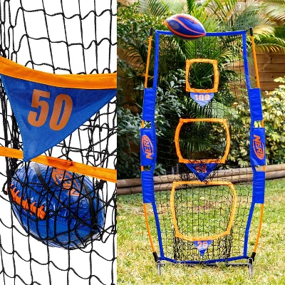 - SET INCLUDES: [1] Football Target, [1] Nerf 8.5″ Stitched Football, [1] Carry Bag, [4] Ground Stakes