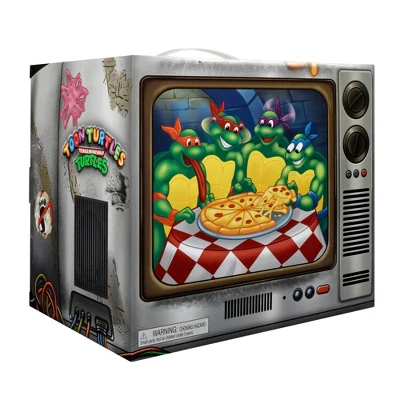 We’re taking TMNT fans back to the beginning with a Classic Toon Turtles Figure 4-Pack! They’re leaping out of television land and into the real world, ready to take on the Foot with tons of Toon Tools that’ll make any Foot fighter faint! Stand back as leader of the troop, Toon Leonardo, unleashes his mighty Toon Katana blades! Toon Raph is armed with his scene-splittin’ Toon Sais, ready to straighten out any scribble-head who dares to draw outside the lines! Toon Don is ready for extra animated action as he fights against the faded Foot with his Toon Bo staffs! And Toon Mikey’s Toon Nunchuks are always ready to do battle against any real-world Foot fools! Each 6” Turtle comes with their signature weapon, an Animated Toon Television, Toon Turtle Pizza Disc, and Turtle Communicator.